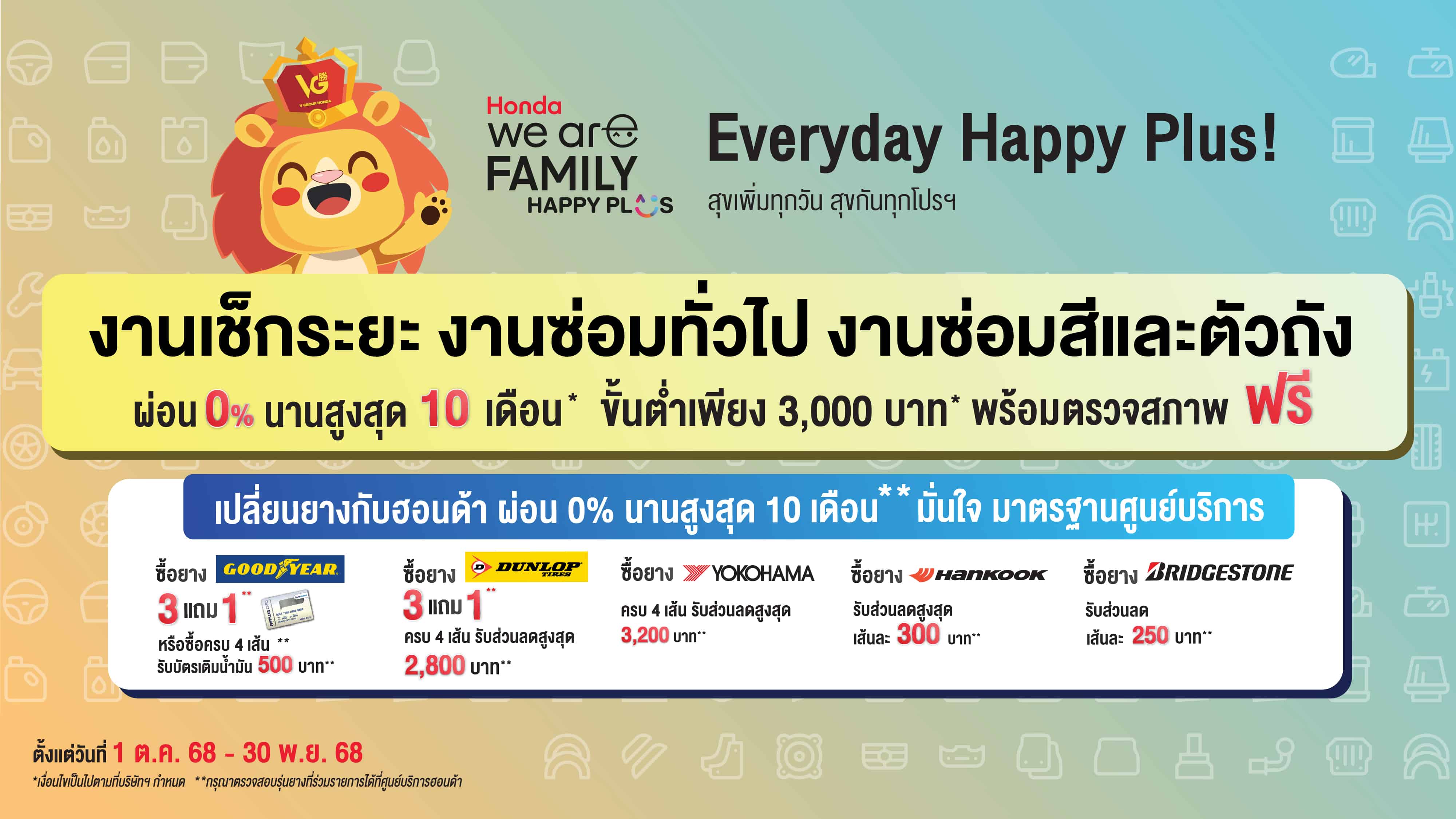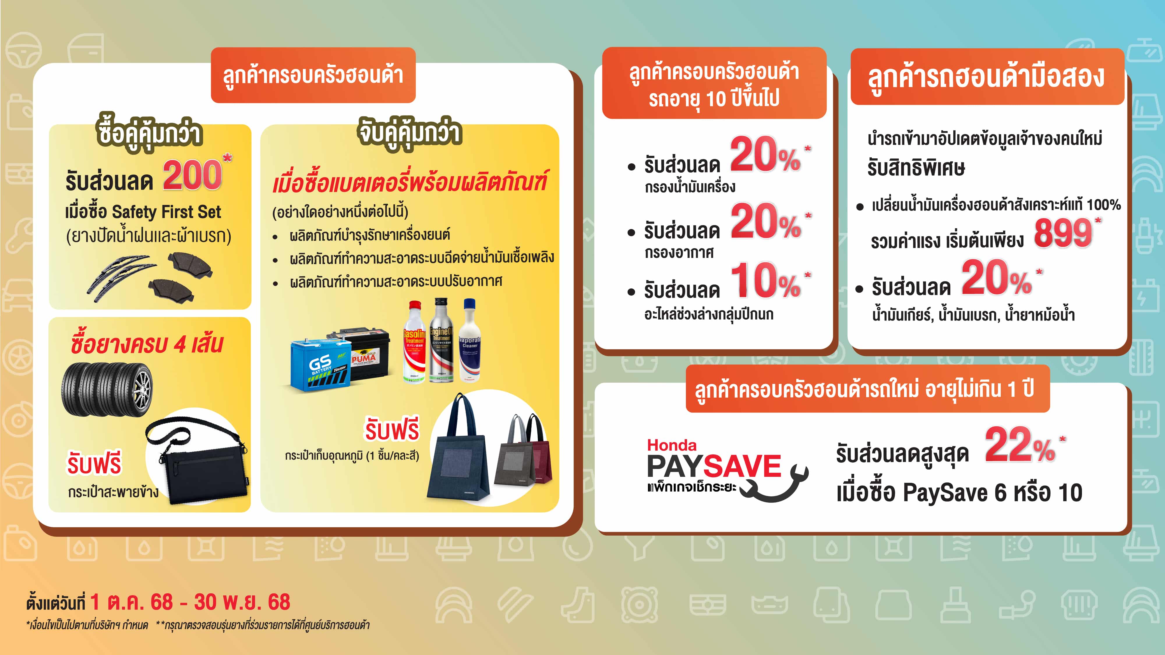 (ตั้งแต่วันที่ 1 ตุลาคม 2568 – 30 พฤศจิกายน 2568 *เงื่อนไขเป็นไปตามที่บริษัทฯ กำหนด **กรุณาตรวจสอบรุ่นยางที่ร่วมรายการได้ที่ศูนย์บริการฮอนด้า)